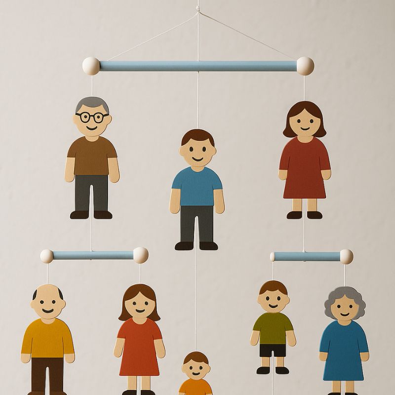 Ein Kinder-Mobile hängt oft über einem Baby-Bett. Es verbindet mehrere Objekte über Drähte und Fäden miteinander.